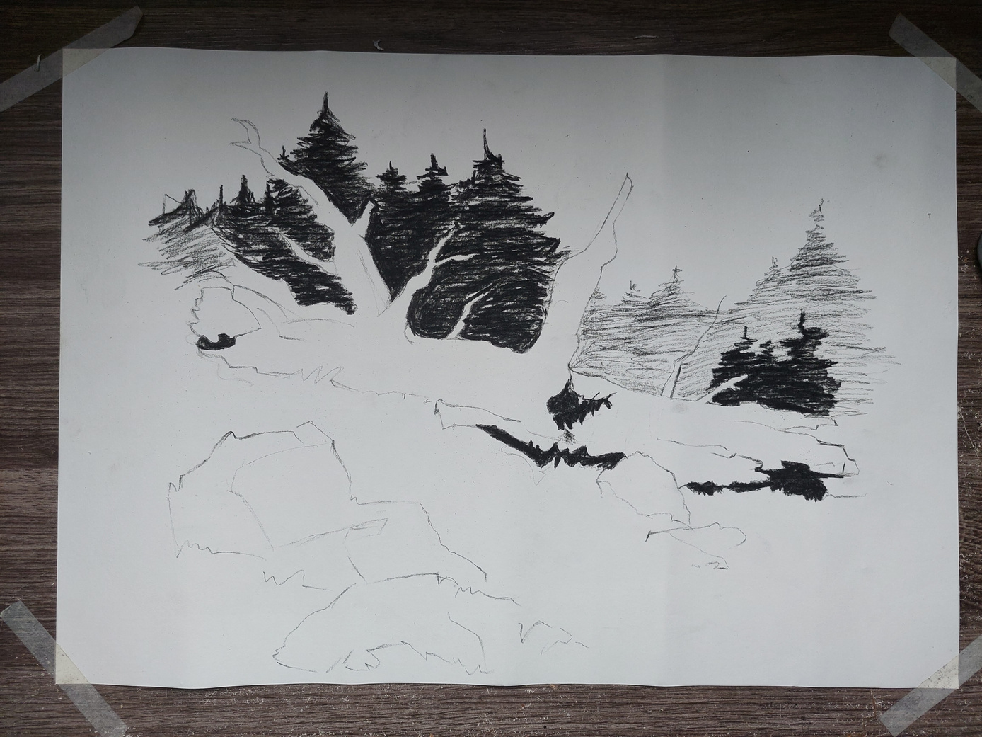No início do processo de produção do desenho, mesmo com o guia, eu tava morrendo de medo de começar, nunca desenhei natureza realista, muito menos morta; e nem com carvão, então foi um desafio no começo, mas ao decorrer do processo as coisas ficaram mais leves e eu tive uma ótima experiência com o desenho, foi muito relaxante.